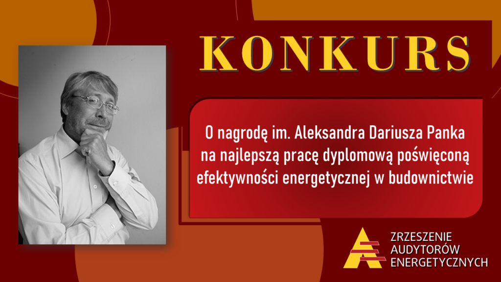 W celu zwiększenia w środowisku akademickim zainteresowania zagadnieniami efektywności energetycznej w budownictwie, promocji absolwentów polskich uczelni na arenie międzynarodowej i wsparcia w rozwoju ich kariery zawodowej oraz uhonorowania działalności Aleksandra Dariusza Panka, założyciela i pierwszego Prezesa ZAE, wybitnego specjalisty i promotora efektywności energetycznej w Polsce Zrzeszenie Audytorów Energetycznych (ZAE) ogłasza Konkurs o nagrodę im. Aleksandra Dariusza Panka na najlepszą pracę dyplomową poświęconą efektywności energetycznej w budownictwie. Do udziału w Konkursie zapraszamy absolwentów studiów inżynierskich lub magisterskich.